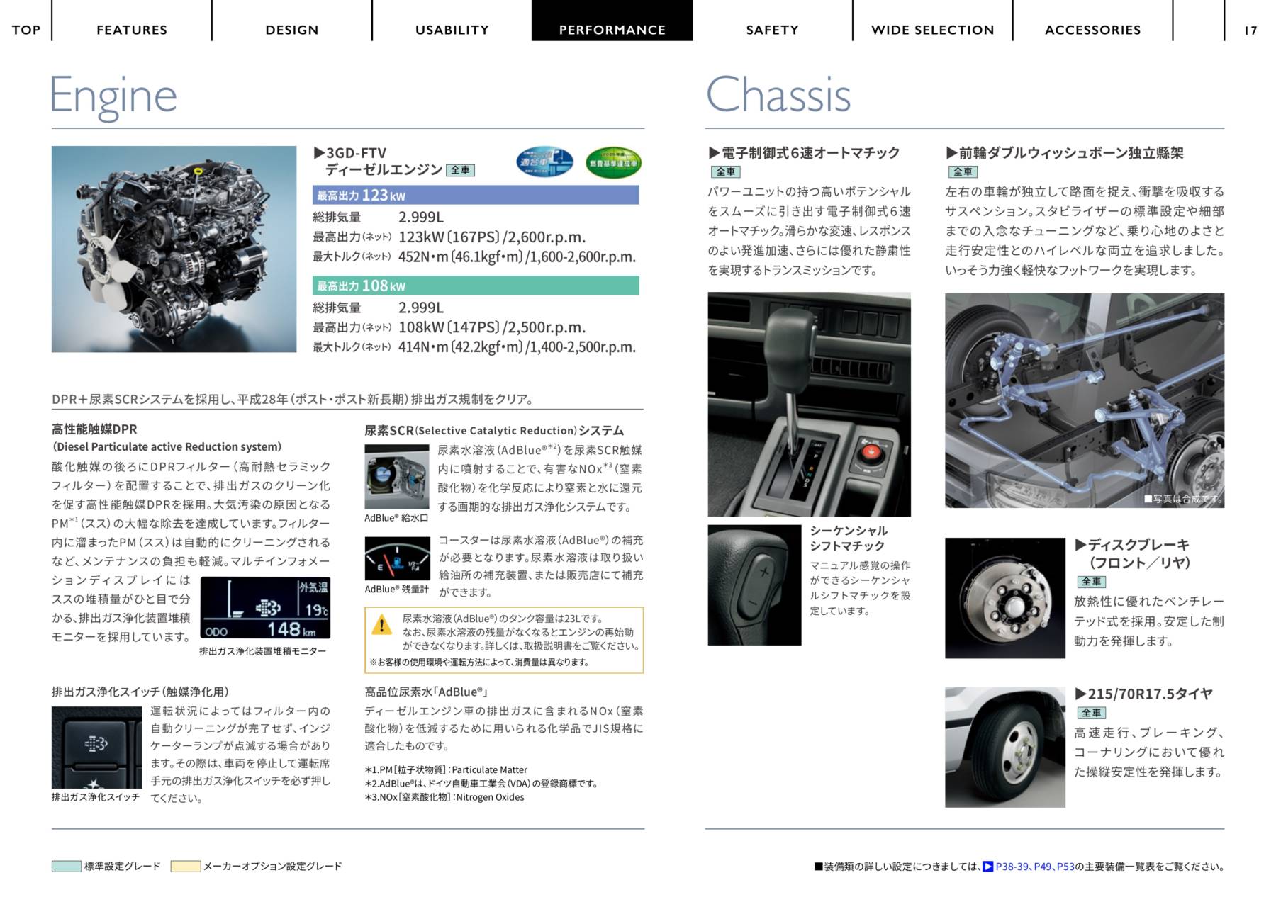 - เครื่องยนต์ดีเซล 3.0L (3GD-FTV) มีทั้งกำลังสูงสุด 123 kW (167 PS) และ 108 kW (147 PS) ตามรุ่นย่อย