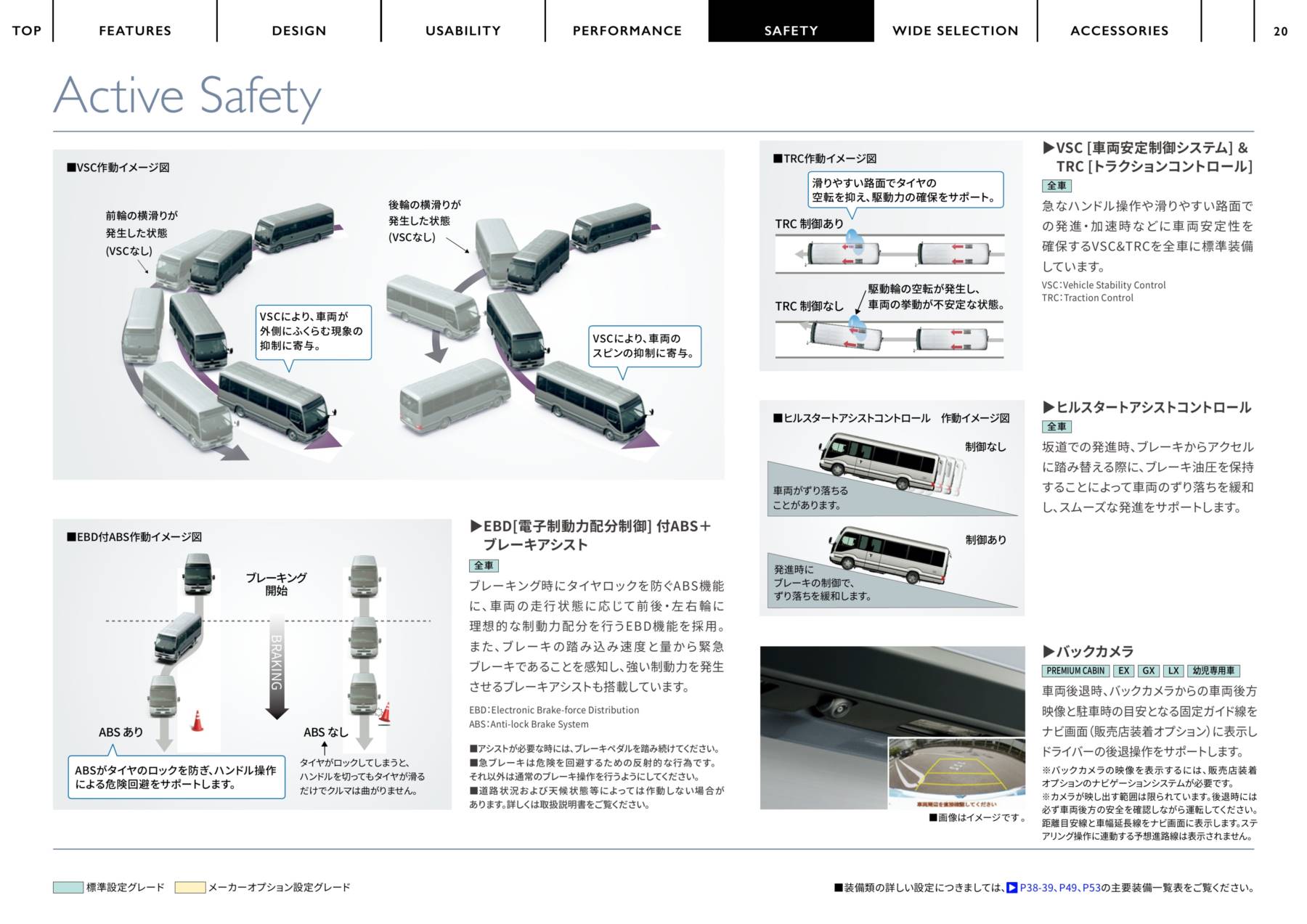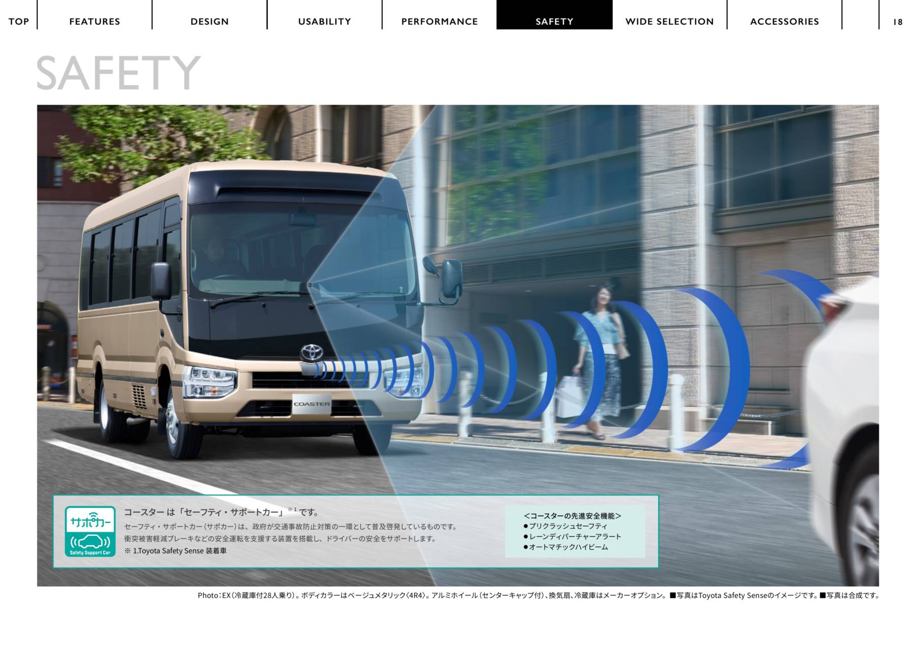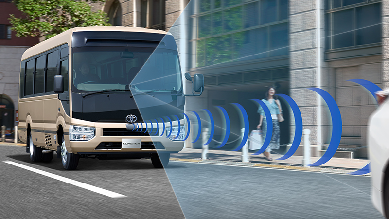 Coaster ถูกระบุว่าเป็น “Safety Support Car” ในรุ่นที่ติดตั้ง Toyota Safety Sense โดยฟังก์ชันหลักได้แก่: