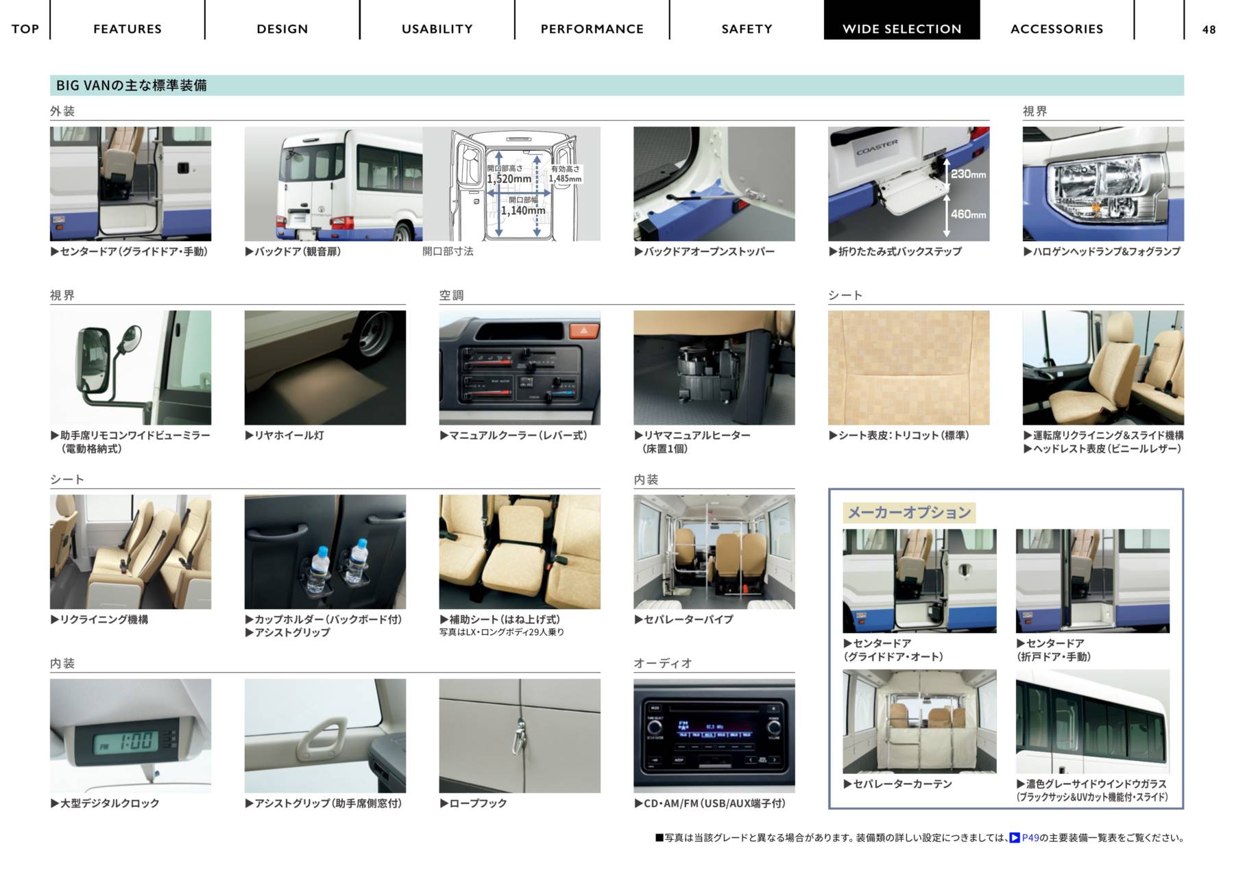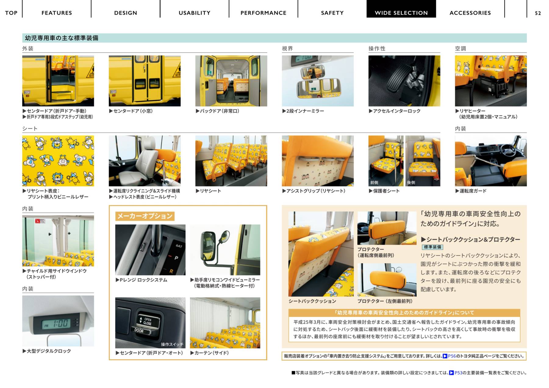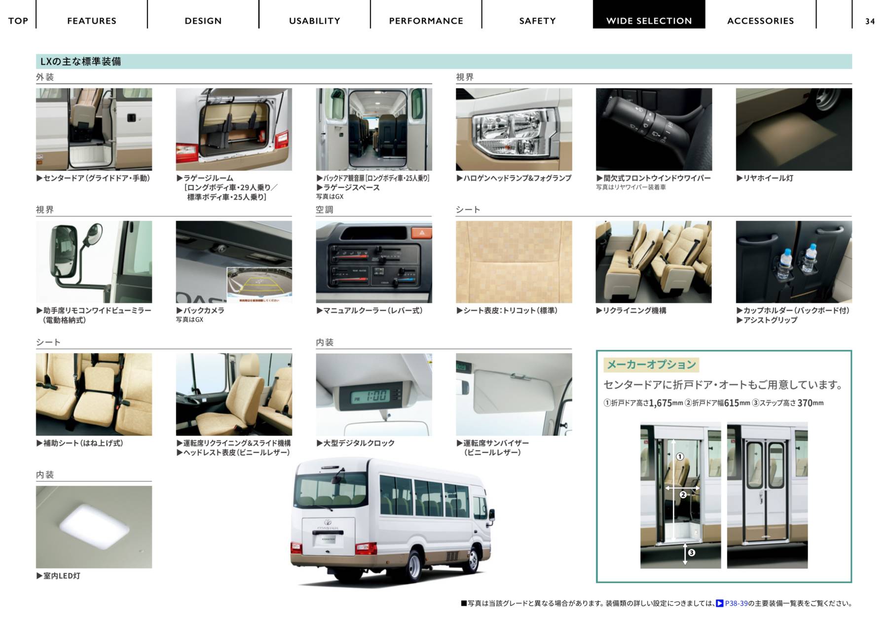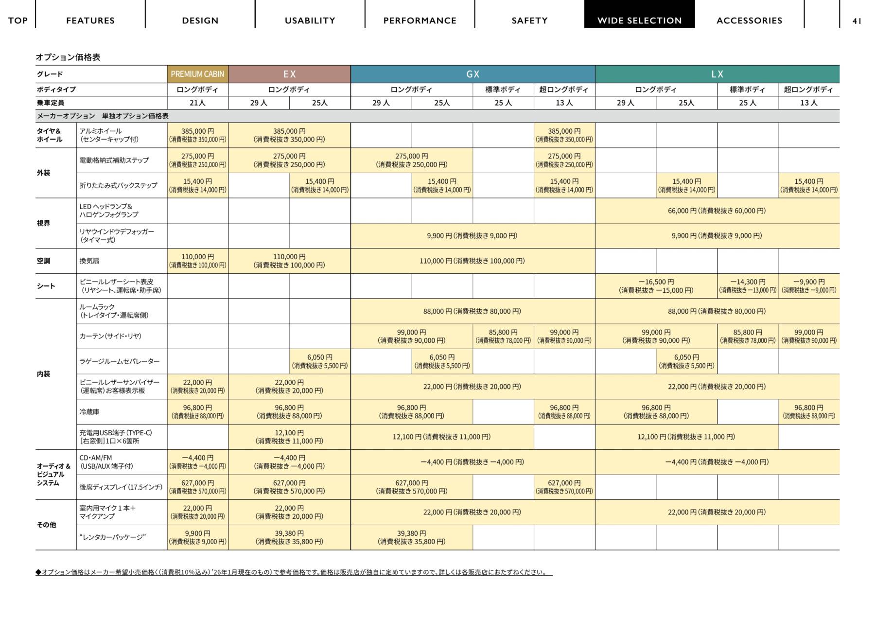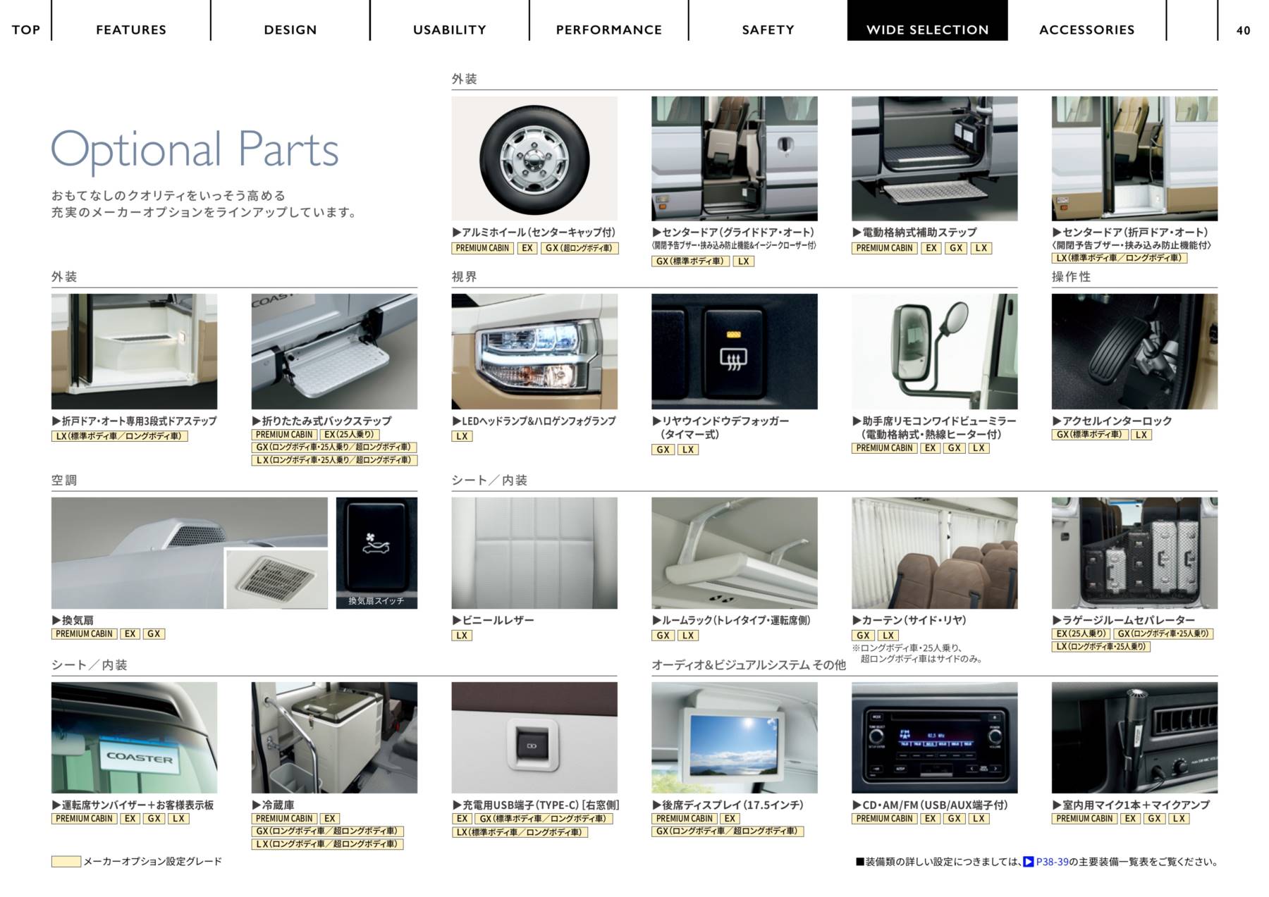 - บางอุปกรณ์เป็น “ออปชันจากโรงงาน” เช่น ล้ออัลลอย (พร้อมฝาครอบดุม), สเต็ปเสริมพับเก็บด้วยไฟฟ้า, พัดลมระบายอากาศ, ตู้เย็น ฯลฯ