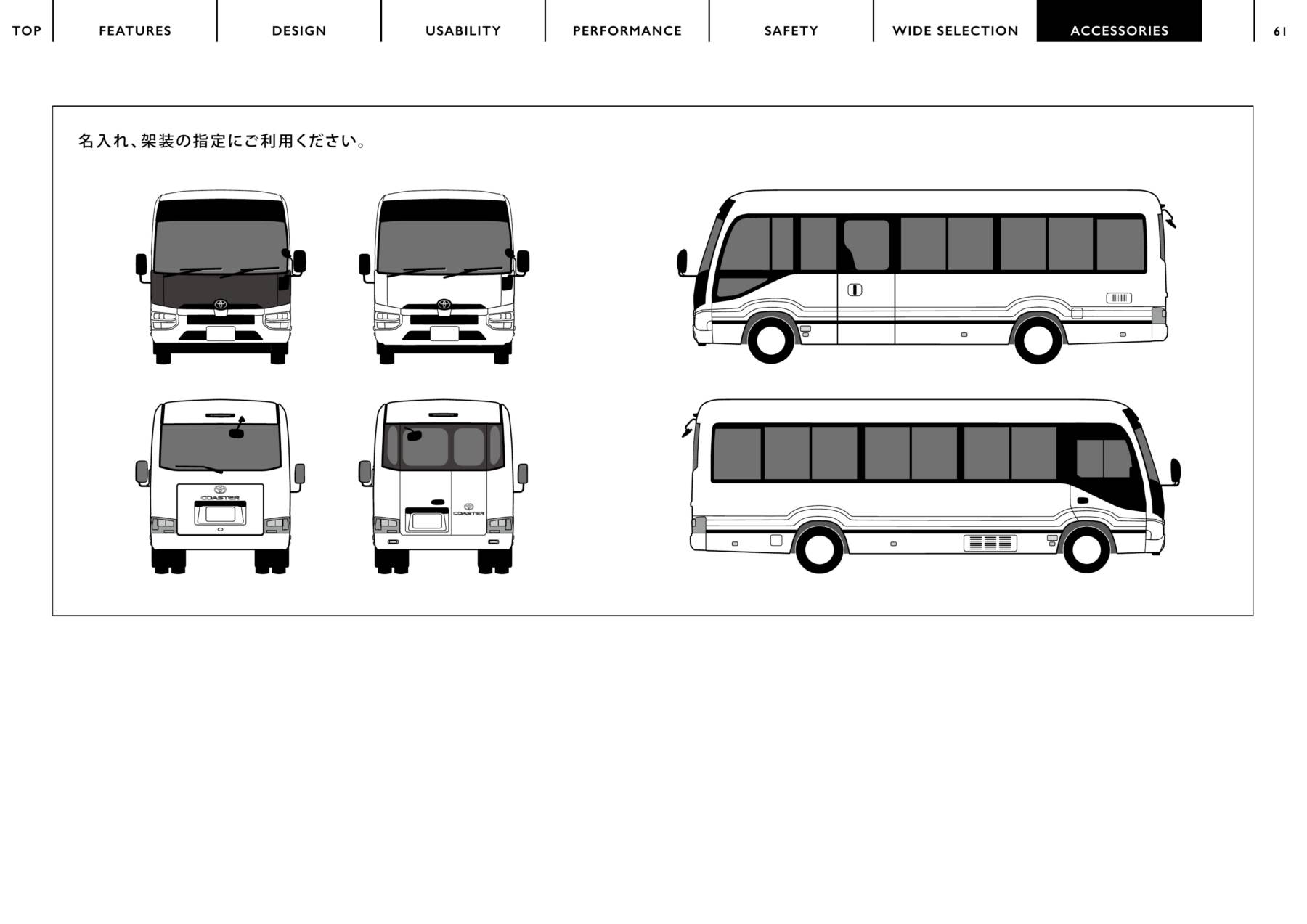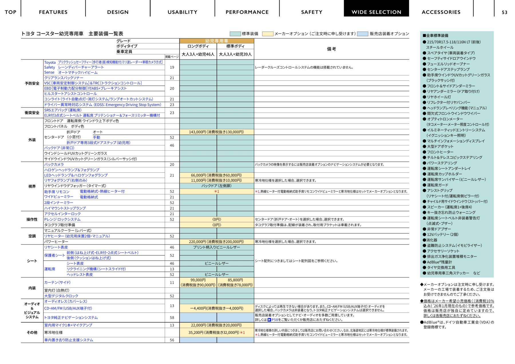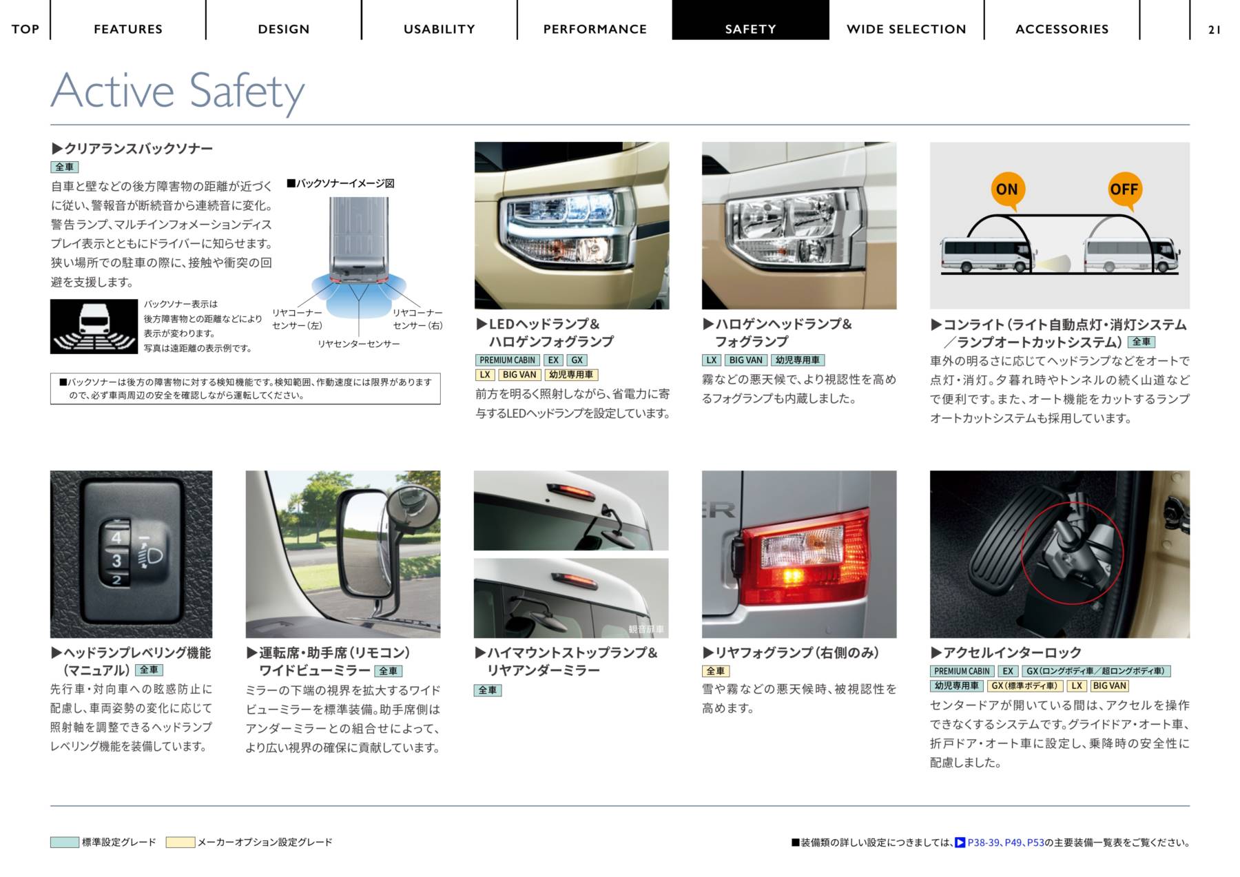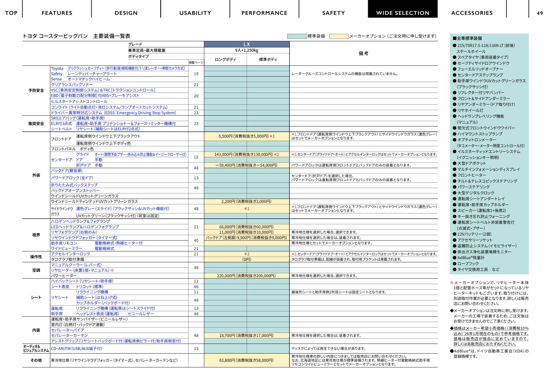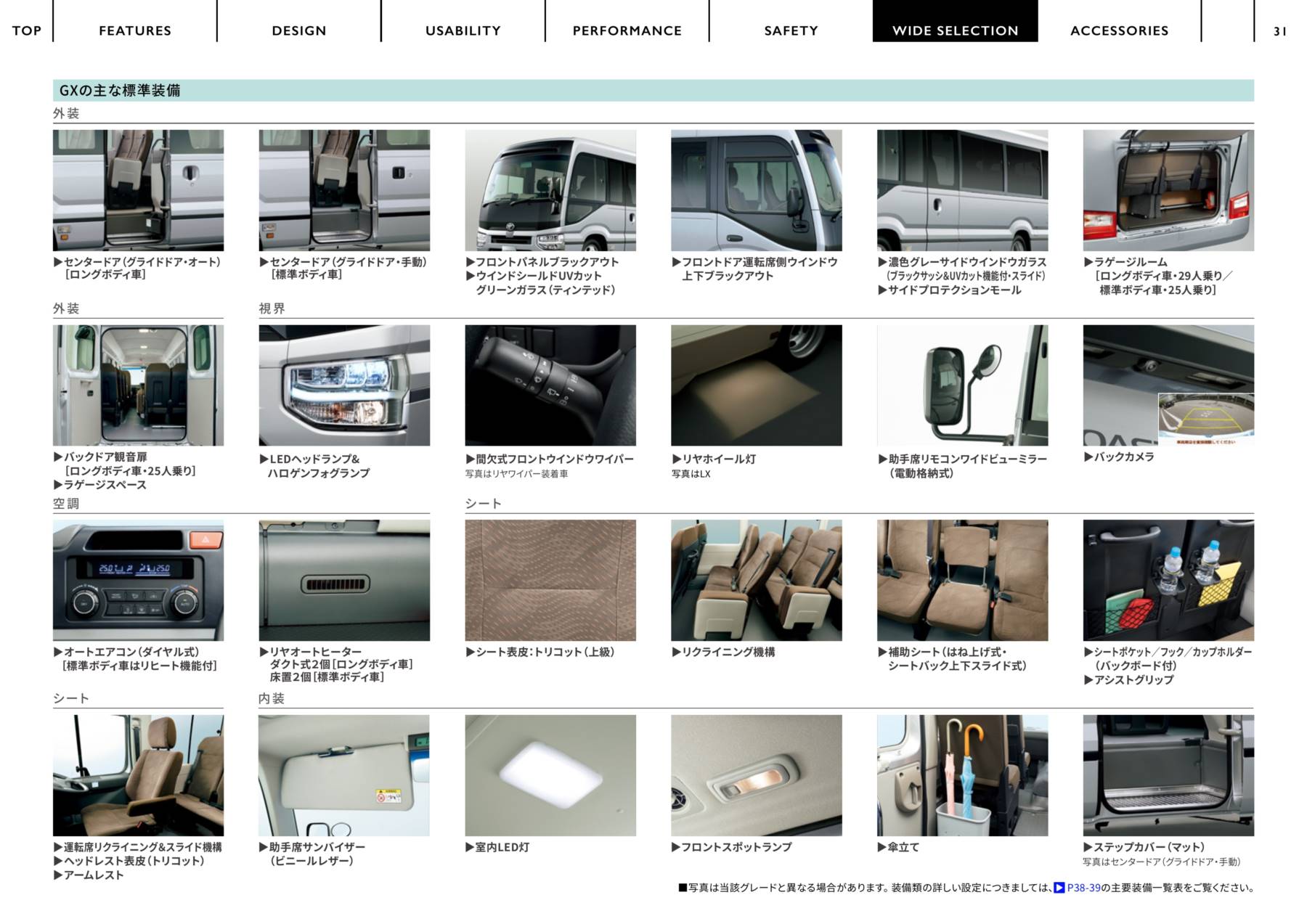 - บางอุปกรณ์เป็น “ออปชันจากโรงงาน” เช่น ล้ออัลลอย (พร้อมฝาครอบดุม), สเต็ปเสริมพับเก็บด้วยไฟฟ้า, พัดลมระบายอากาศ, ตู้เย็น ฯลฯ