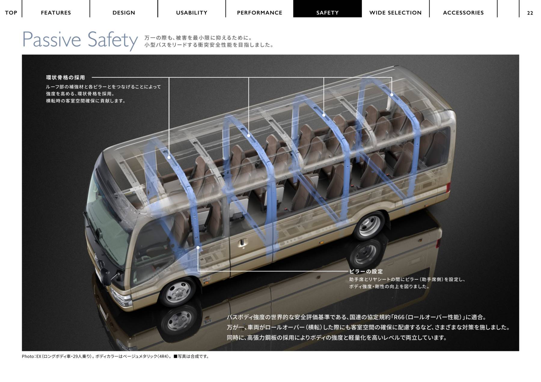 - ผ่านเกณฑ์ UN R66 (มาตรฐานสมรรถนะการพลิกคว่ำของตัวถังรถบัส) ตามที่โบรชัวร์ระบุ