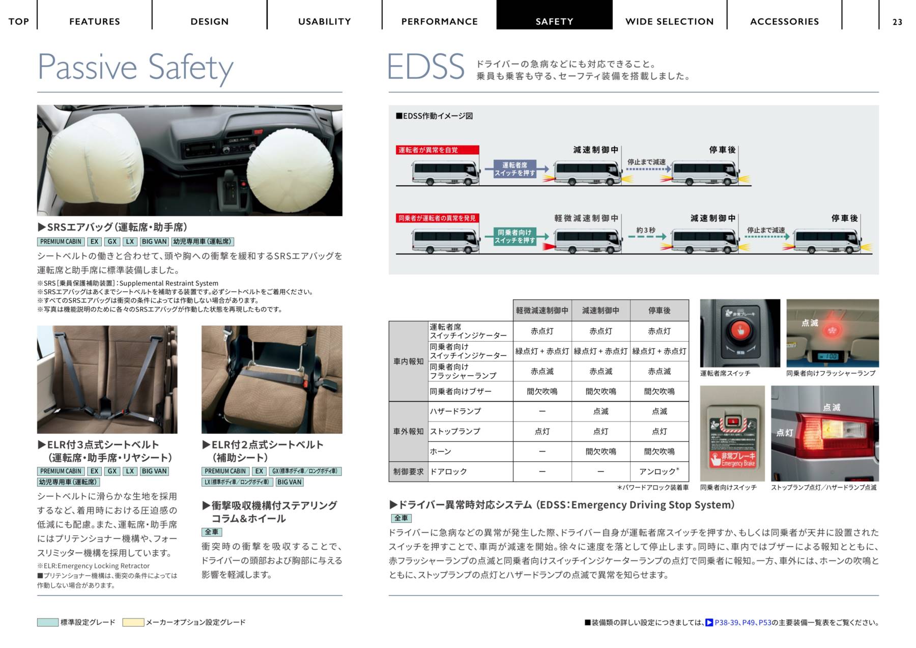 EDSS (Emergency Driving Stop System) เมื่อคนขับมีอาการผิดปกติ คนขับสามารถกดสวิตช์ที่ตำแหน่งคนขับ หรือผู้โดยสารสามารถกดสวิตช์บนเพดาน รถจะเริ่มชะลอความเร็วและหยุดอย่างค่อยเป็นค่อยไป พร้อมแจ้งเตือนในรถ (บัซเซอร์/ไฟกระพริบ) และแจ้งเตือนภายนอก (แตร/ไฟเบรก/ไฟฉุกเฉิน) ตามที่โบรชัวร์อธิบาย