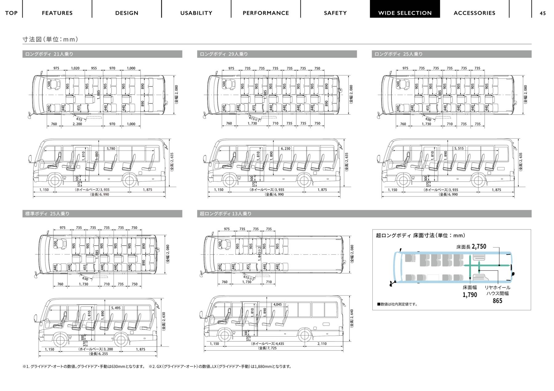 - ความยาวรวม: 6,255 มม. (ตัวถังมาตรฐาน) / 6,990 มม. (ตัวถังยาว) / 7,725 มม. (ตัวยาวพิเศษ)