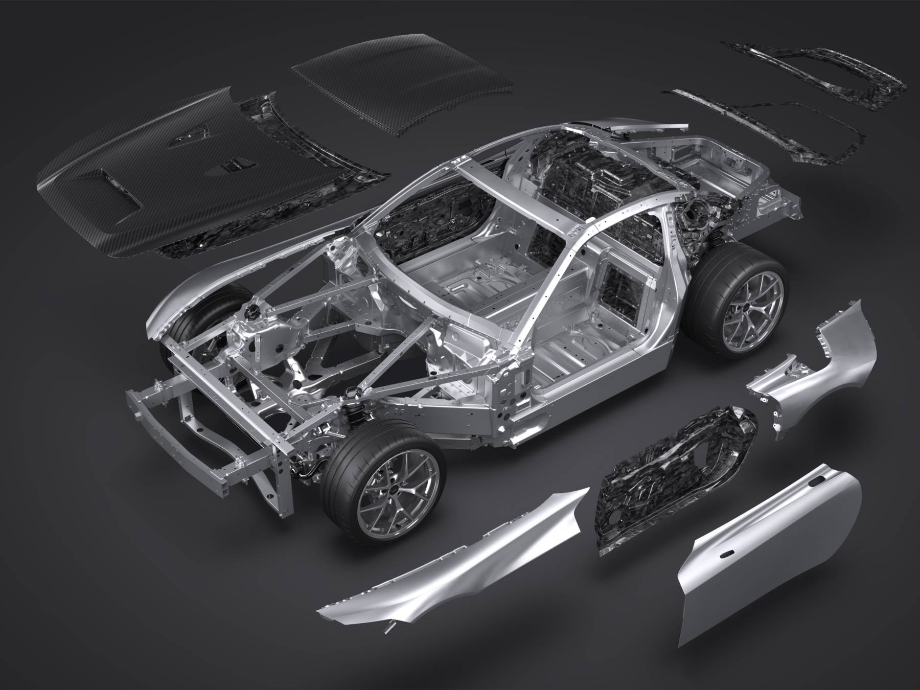 ตัวรถถูกสร้างบนเฟรมอะลูมิเนียมเต็มรูปแบบ ใช้แผงภายนอกแบบ Aluminum + CFRP เพื่อลดน้ำหนักแต่ยังคงความแข็งแรงสูง เพิ่มความมั่นใจในการขับความเร็วสูง