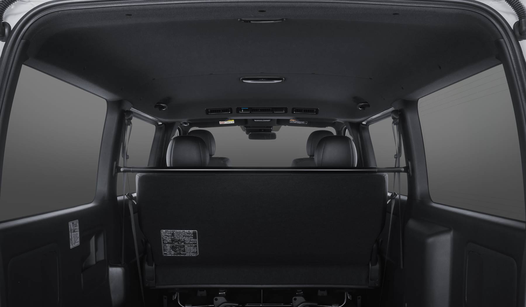 ภายในห้องโดยสารของ DARK PRIME S ถูกออกแบบให้ต่างจาก Hiace ทั่วไป โดยเน้นโทนสีเข้ม วัสดุคุณภาพ และลวดลายที่ให้กลิ่นอายสปอร์ต เหมาะทั้งการใช้งานเชิงพาณิชย์ระดับพรีเมียม และการดัดแปลงเป็นรถส่วนตัว
