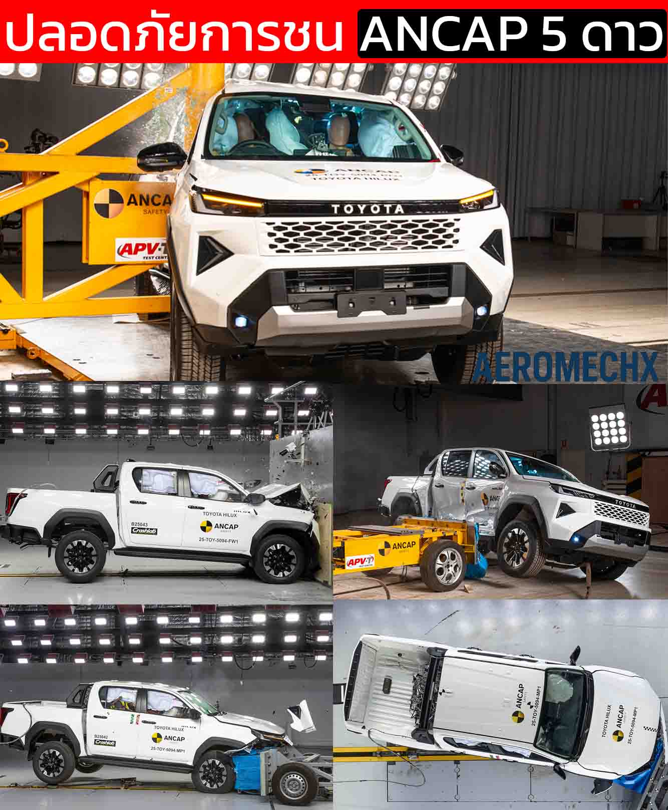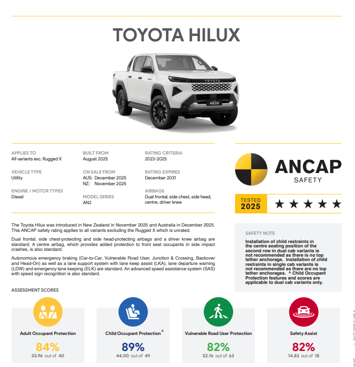 Toyota Hilux รุ่นใหม่ ทำผลงานยอดเยี่ยมในการทดสอบความปลอดภัยของ ANCAP ปี 2025 คว้าเรตติ้งสูงสุดระดับ 5 ดาว ครอบคลุมรุ่นเครื่องยนต์ดีเซล 2.8 ลิตร ทั้งแบบปกติและ 48V Mild Hybrid สำหรับตัวถังกระบะ (Utility) ทุกรุ่นย่อยในออสเตรเลียและนิวซีแลนด์ ยกเว้นรุ่นตกแต่งพิเศษอย่าง Rugged X ที่ไม่ได้เข้ารับการจัดเรตติ้งครั้งนี้