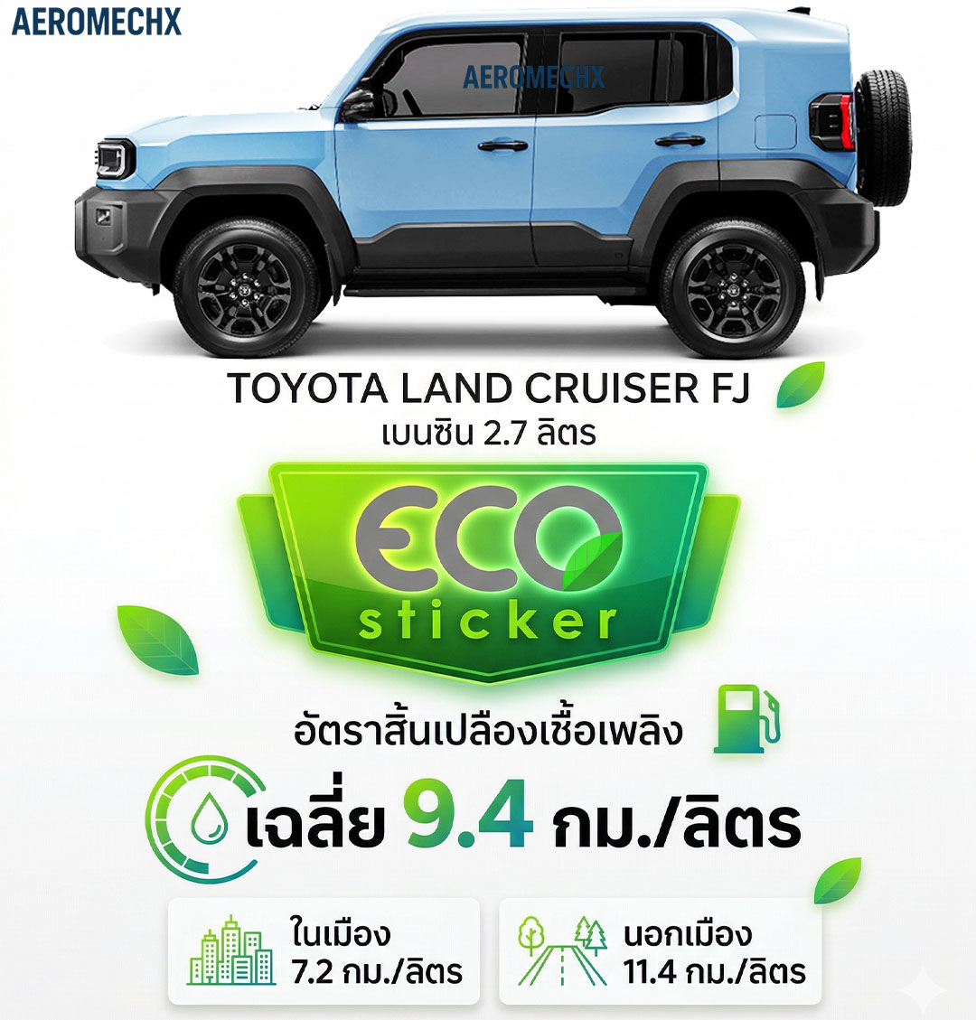 • เคลมอัตราสิ้นเปลืองเชื้อเพลิงเฉลี่ย 9.4 กม./ลิตร (ECO Sticker)