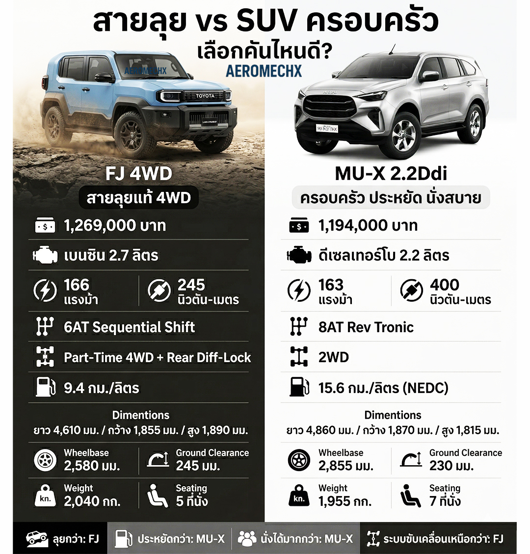 • เบรกมือแบบก้าน (Lever Hand brake): เน้นความดิบและความทนทานสไตล์รถลุยดั้งเดิม (ไม่ใช่เบรกมือไฟฟ้า)