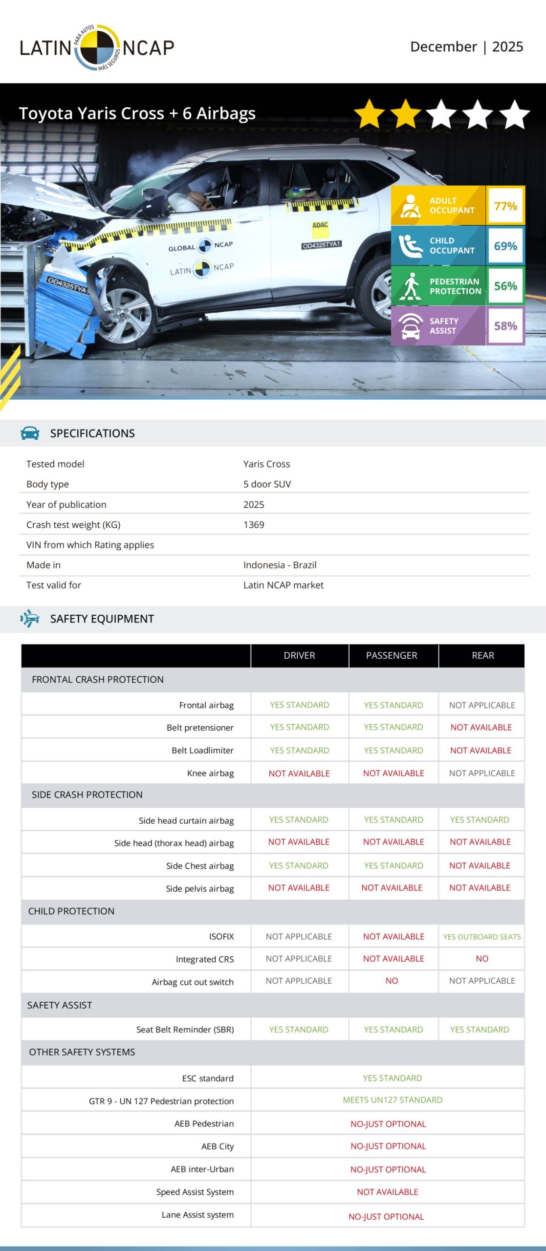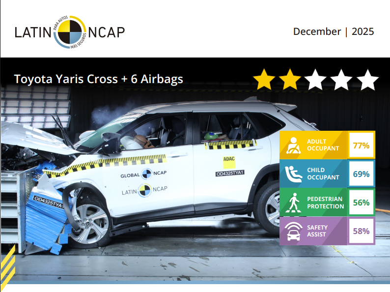 เผยแพร่วันที่ 11 ธันวาคม 2025 Latin NCAP เผยผลทดสอบความปลอดภัยล่าสุดของ Toyota Yaris Cross รุ่นติดตั้งถุงลมนิรภัย 6 ตำแหน่ง ซึ่งผลิตจากอินโดนีเซียและบราซิล ทำตลาดในภูมิภาคลาตินอเมริกา โดยผลการทดสอบสะท้อนให้เห็นภาพรวมด้านโครงสร้างตัวถัง การปกป้องผู้โดยสาร และระบบช่วยขับ (ADAS) ตามมาตรฐานใหม่ที่เข้มงวดขึ้นเรื่อย ๆ