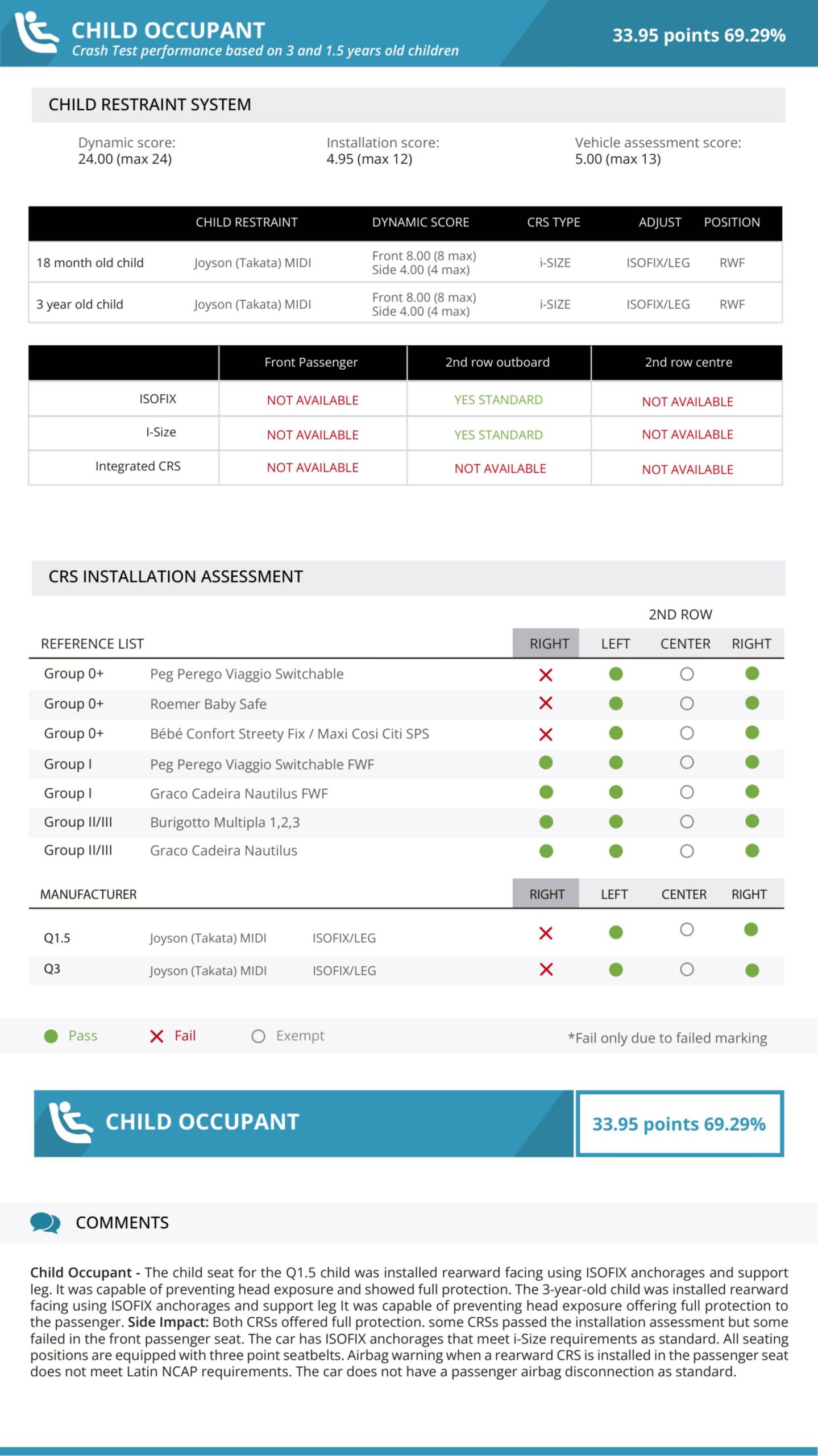 คะแนนหมวด Child Occupant อยู่ที่ 69% จัดว่าอยู่ในระดับปานกลางไปจนถึงดี โดยเฉพาะเมื่อใช้เบาะนั่งนิรภัยสำหรับเด็กอย่างถูกต้องตามคำแนะนำของผู้ผลิต