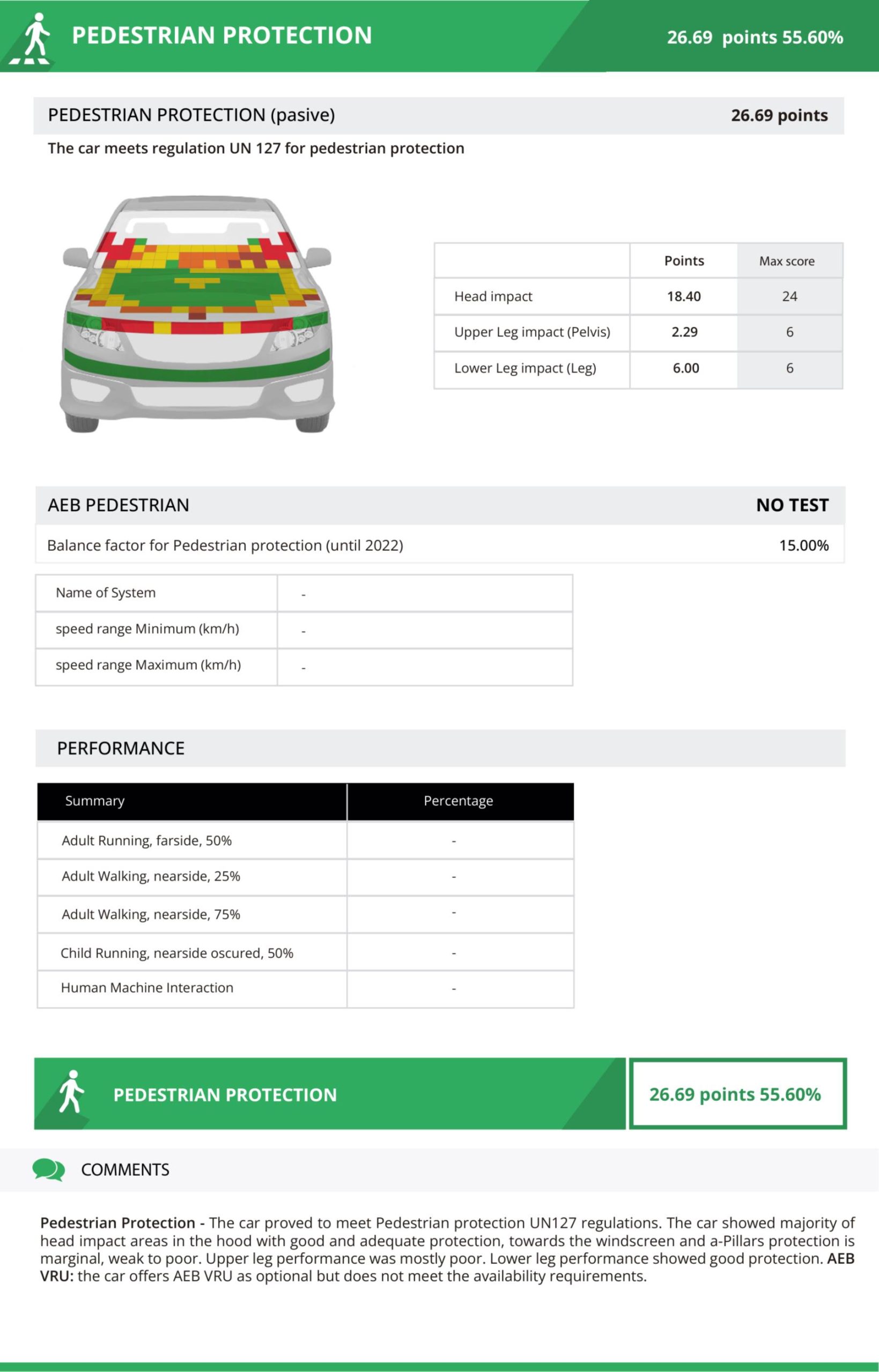 หมวด Pedestrian Protection Yaris Cross ทำคะแนนได้ประมาณ 56% ซึ่งจัดว่า “พอใช้” เมื่อเปรียบเทียบกับมาตรฐานปัจจุบันของ Latin NCAP
