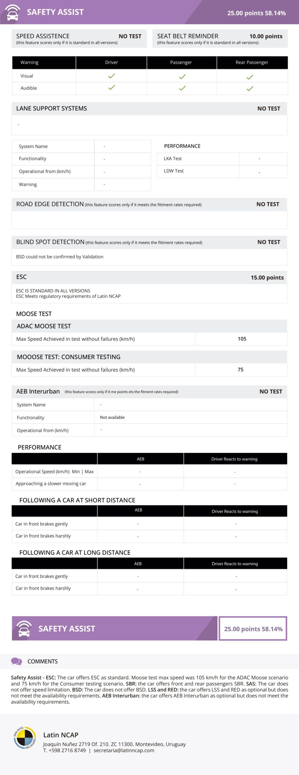 • AEB City / AEB Interurban / AEB Pedestrian – มีในบางรุ่นย่อยเท่านั้น ไม่ผ่านเกณฑ์อัตราการติดตั้งขั้นต่ำของ Latin NCAP จึงไม่ได้คะแนน