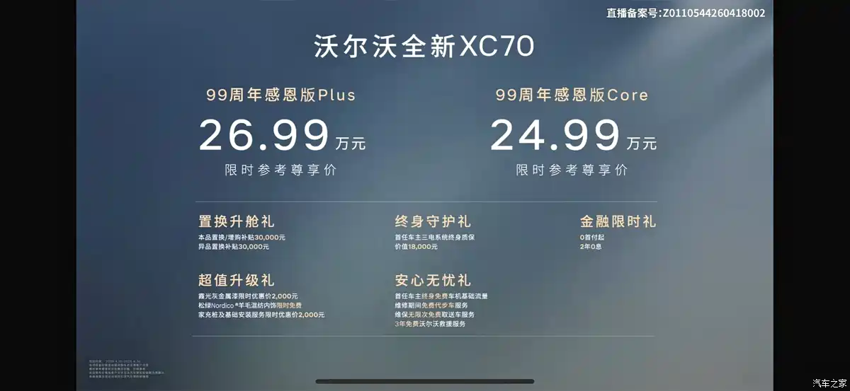 Volvo XC70 รุ่นฉลองครบรอบ 99 ปี ได้เปิดตัวอย่างเป็นทางการแล้ว รถยนต์รุ่นใหม่นี้มีให้เลือกสองรุ่น โดยมีราคาแนะนำอย่างเป็นทางการอยู่ที่ 411,900-431,900 หยวน และราคาโปรโมชั่นพิเศษในช่วงเวลาจำกัดอยู่ที่ 249,900-269,900 หยวนเมื่อเทียบกับรุ่นปัจจุบัน หรือประมาณ 1.17 – 1.26 ล้านบาท
