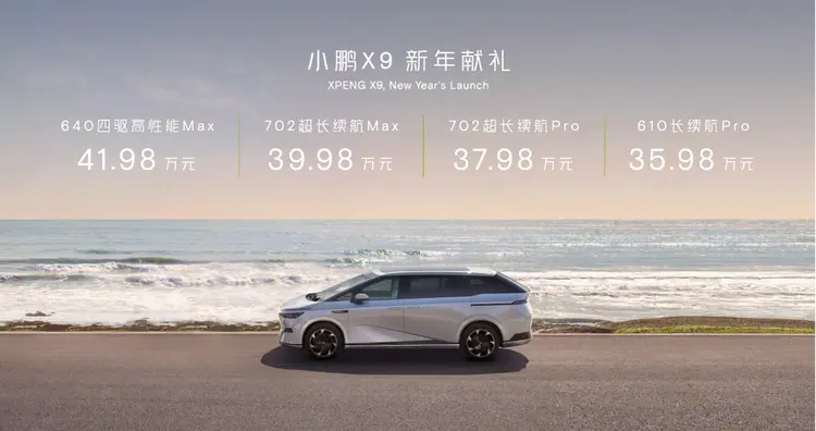 วันที่ 1 มกราคม 2024 Xpeng X9 ประกาศราคาจำหน่ายอย่างเป็นทางการในประเทศจีน เริ่มต้นที่ 359,800 – 419,800 หยวน หรือประมาณ 1.68 – 1.96 ล้านบาท ในฐานะผลิตภัณฑ์เรือธงของ Xpeng Motors