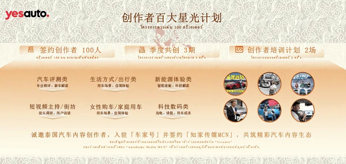 เพื่อขับเคลื่อนวงการเนื้อหารถยนต์ในไทย YesAuto ได้ประกาศรับสมัครครีเอเตอร์ในโครงการ “百大星光计划” (100 Starlight Program) โดยเน้นย้ำว่านี่ไม่ใช่แค่การเซ็นสัญญา แต่คือการ “สร้างสรรค์ร่วมกัน” (Co-creation)