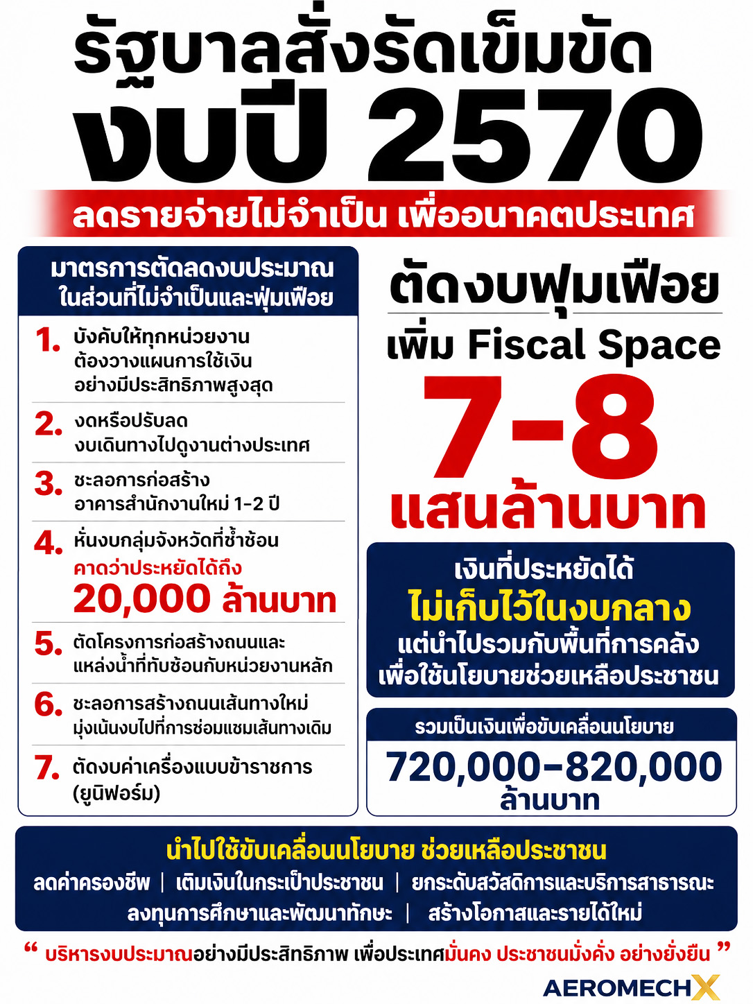 - อัดฉีดเม็ดเงินสู่โครงการ “ไทยช่วยไทย”: เม็ดเงินที่ประหยัดได้จะไม่ถูกนำไปเก็บไว้ในงบกลาง แต่จะนำมารวมกับช่องว่างทางการคลัง (Fiscal Space) ราว 7-8 แสนล้านบาท เพื่อดำเนินนโยบายช่วยเหลือประชาชน ได้แก่: